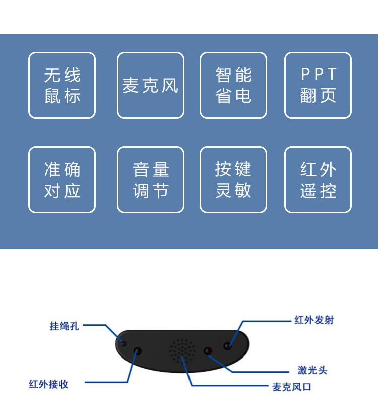 自主研發(fā)集遙控器、鼠標(biāo)、麥克風(fēng)、翻頁器、激光筆于一體,支持課件翻頁、課堂擴(kuò)音等課堂操作功能,產(chǎn)品自帶鋰電池,續(xù)航時(shí)間長達(dá)8小時(shí),紅外傳輸距離可達(dá)20米。