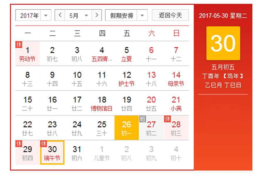 端午節(jié)即將來(lái)臨,端午節(jié)是我國(guó)最大的傳統(tǒng)節(jié)日之一。根據(jù)國(guó)務(wù)院辦公廳有關(guān)文件精神,2017年端午節(jié)放假時(shí)間安排如下: